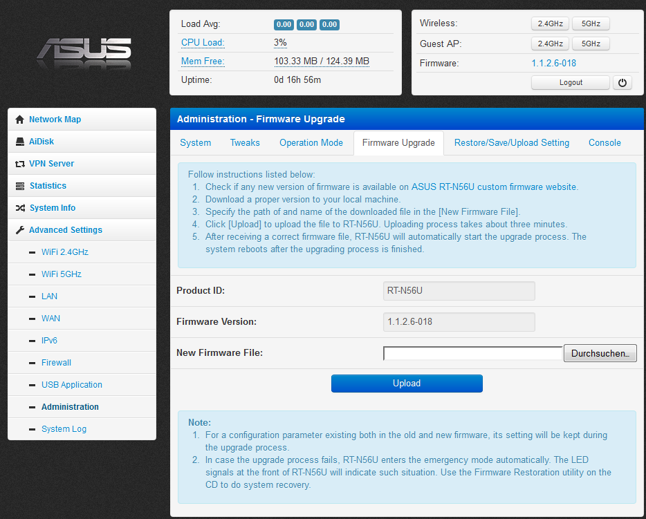 Die Installation der ASUS RT-N56U Custom Firmware funktioniert wie bei der Originalfirmware. Man kann jederzeit ältere oder neuere Versionen über das Webinterface installieren.