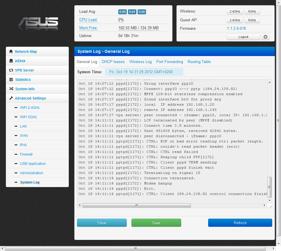 ASUS RT-N56U mit Firmware RT-N56U_1.1.2.6-018 (en-ru). IPv4 only. Linux kernel 2.6.21.x from wive-rtnl