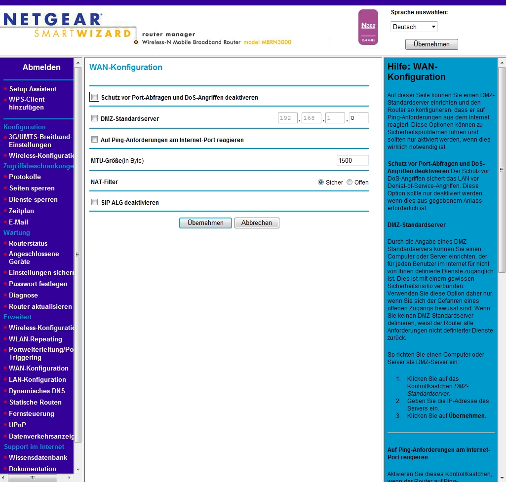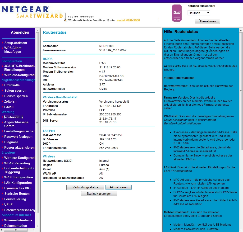 Der Router Netgear MBRN3000 läuft nun seit 3 Wochen absolut stabil. Wie wir bereits bei den Routern TP-Link TL-MR3420 und Dovado 4GR berichtet haben, stürzen diese mehrmals in einer Woche ab. Dieses Problem hat der Netgear MBRN3000 4G/3G-Router nicht. Der Router läuft absolut stabil und baut ohne Probleme eine neue Verbindung auf, wenn der Provider z.B. bei der 24 Stunden Zwangstrennung die Verbindung kappt.